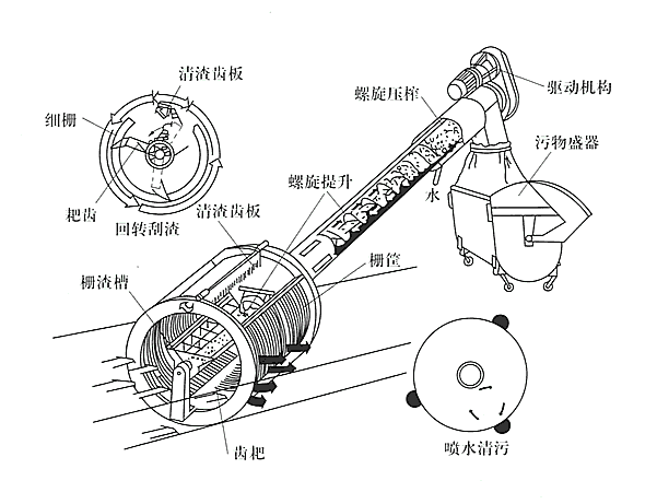 根據(jù)轉(zhuǎn)鼓式格柵的轉(zhuǎn)鼓類型,分為齒條刮板型(螺旋式)和濾網(wǎng)轉(zhuǎn)鼓型(旋轉(zhuǎn)式)兩種。